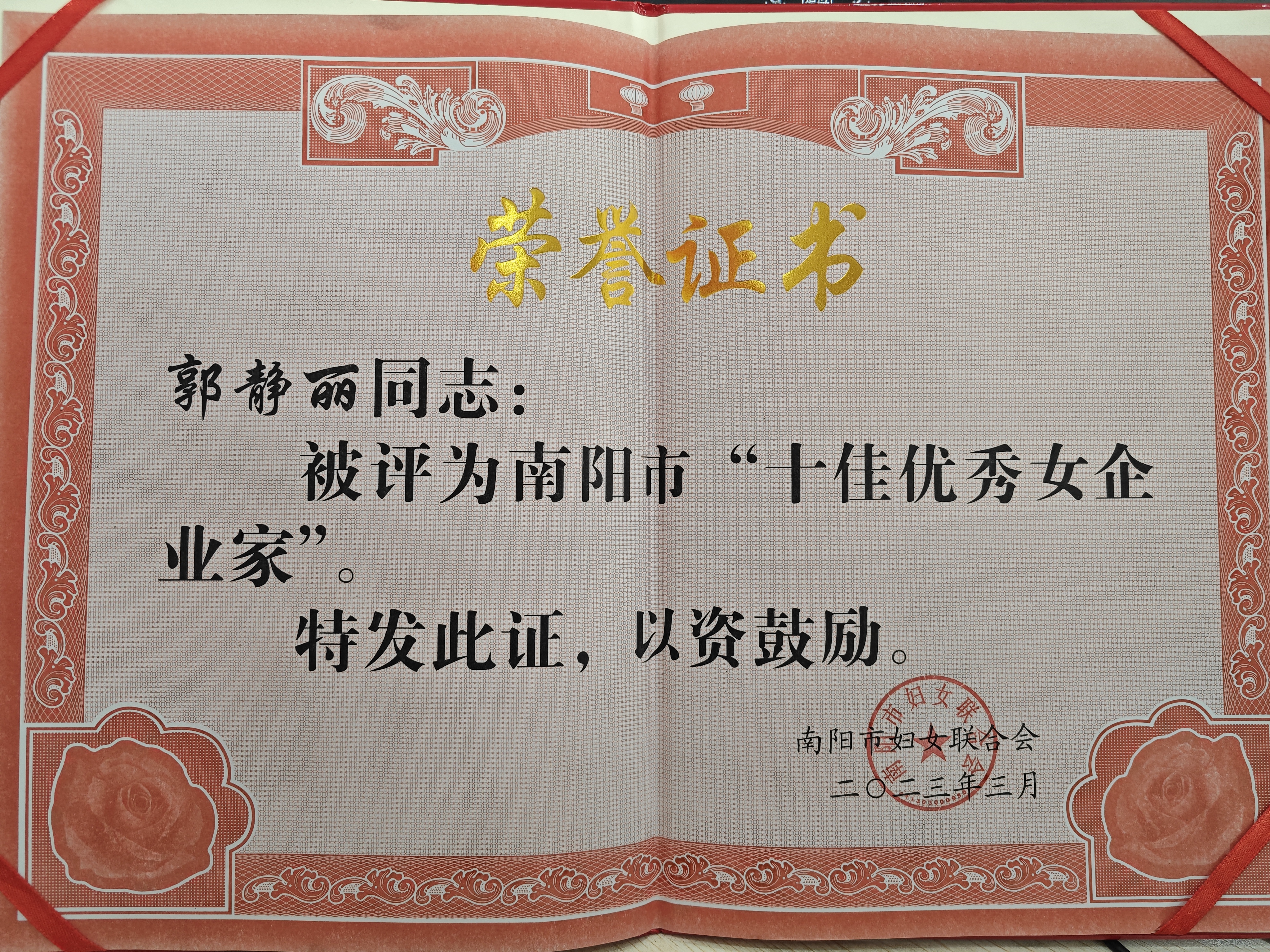 - 熱烈祝賀河南天曼服飾 郭靜麗董事長榮獲南陽市十大優秀女企業家榮譽稱號