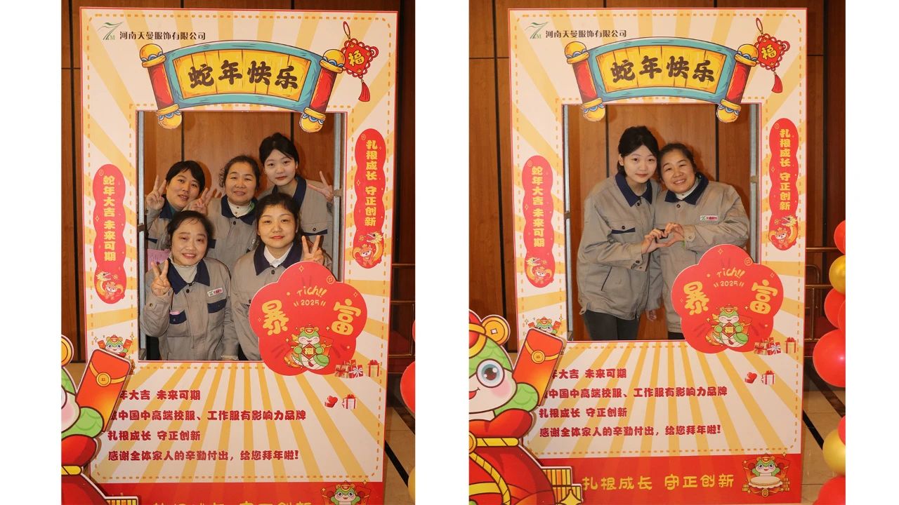 2025年元月23日上午,河南天曼服飾400多名員工歡聚一堂,歡快喜慶的年會(huì)現(xiàn)場(chǎng)張燈結(jié)彩,處處洋溢著天曼人的歡歌笑語,喜慶的吉祥門前大家紛紛拍照合影,相互祝福、相互問候,交流著一年的收獲喜悅。