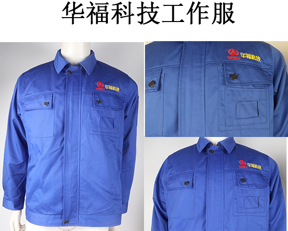 華福科技工作人員主要也是車間流水工作大部分是男性員工,在設(shè)計(jì)顏色采用了深藍(lán)色,還是傳統(tǒng)的工裝款式,布料采用滌棉紗卡,這種面料勻整光潔,質(zhì)樸柔和,吸濕耐磨,尤其經(jīng)過(guò)熨燙后,柔軟舒適,沒(méi)有折痕,是作為工裝的首選面料。