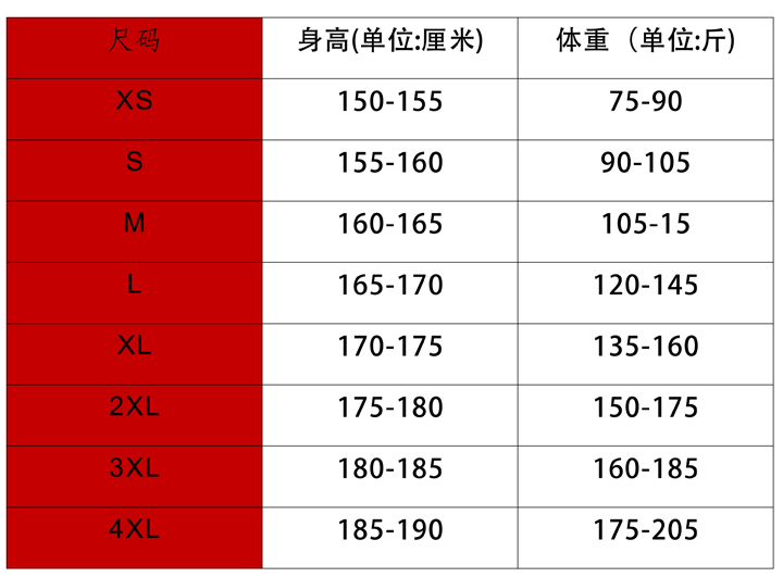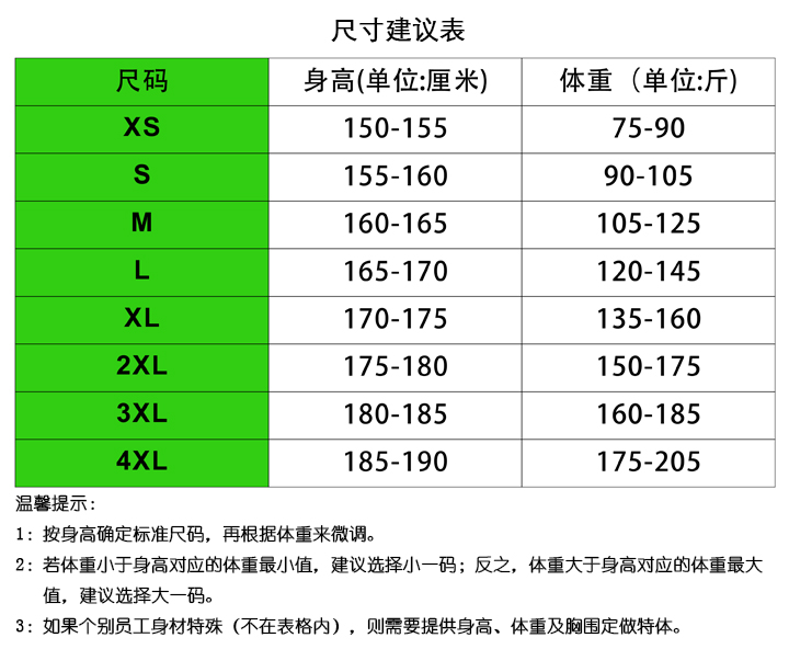溫馨提示:請對照每個員工的身高和體重選擇尺碼,根據您訂購的產品,選擇相應的尺碼圖表,先用身高畫出橫線,再用體重畫出豎線,交叉點所在色塊表示合適的尺碼(身高單位:cm,體重單位:kg)