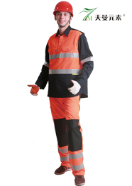 褲子:前門刀防火拉鏈,兩個斜插褲兜,兩條5CM反光條環(huán)繞褲腿各一周。