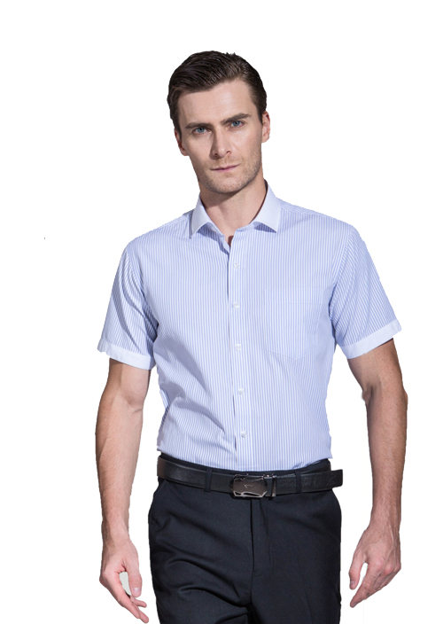 品名:男短袖小領襯衣;版型:普通版;貨號:TWD6001 ;面料:T6001;顏色:藍豎條紋白領白袖口 ;Fabric:C60/T40/80/2S*45S