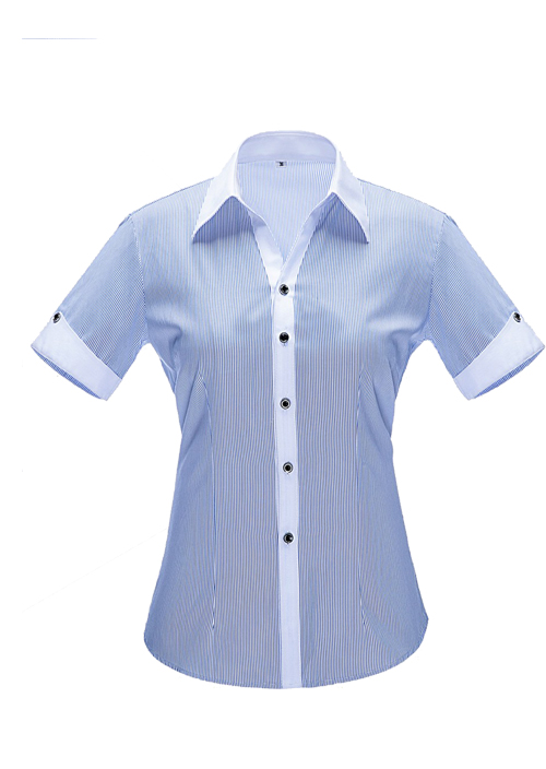 品名:女短袖v領(lǐng)襯衣;版型:修身版;貨號:YWD3501 ;面料:Y3501;顏色:藍(lán)色細(xì)條紋 ;Fabric:C35/T65