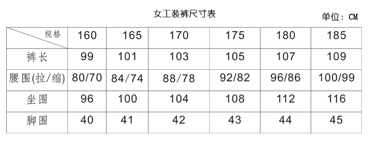 工裝上衣尺碼表